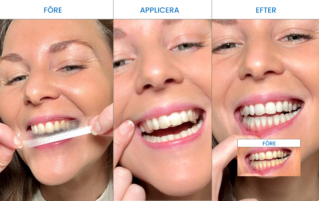 Vitare tänder direkt – Du kommer att se resultat av vitare tänder redan efter första behandlingen. 100% säker tandblekning – Vår tandblekning är helt fri från peroxider och skadar därför inte emalj eller tandkött. Räcker till 14 behandlingar – Kitet innehåller totalt 28 st strips och räcker till 14 behandlingar. PAP-gel för bäst resultat – Vår gel innehåller PAP-gel som är den senaste innovationen på marknaden inom tandblekning.